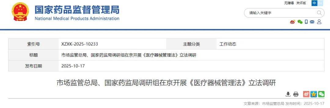 今年10月,市场监管总局党组成员、副局长束为和国家药监局党组成员、副局长徐景和率调研组在京就《医疗器械管理法》草案开展立法调研。