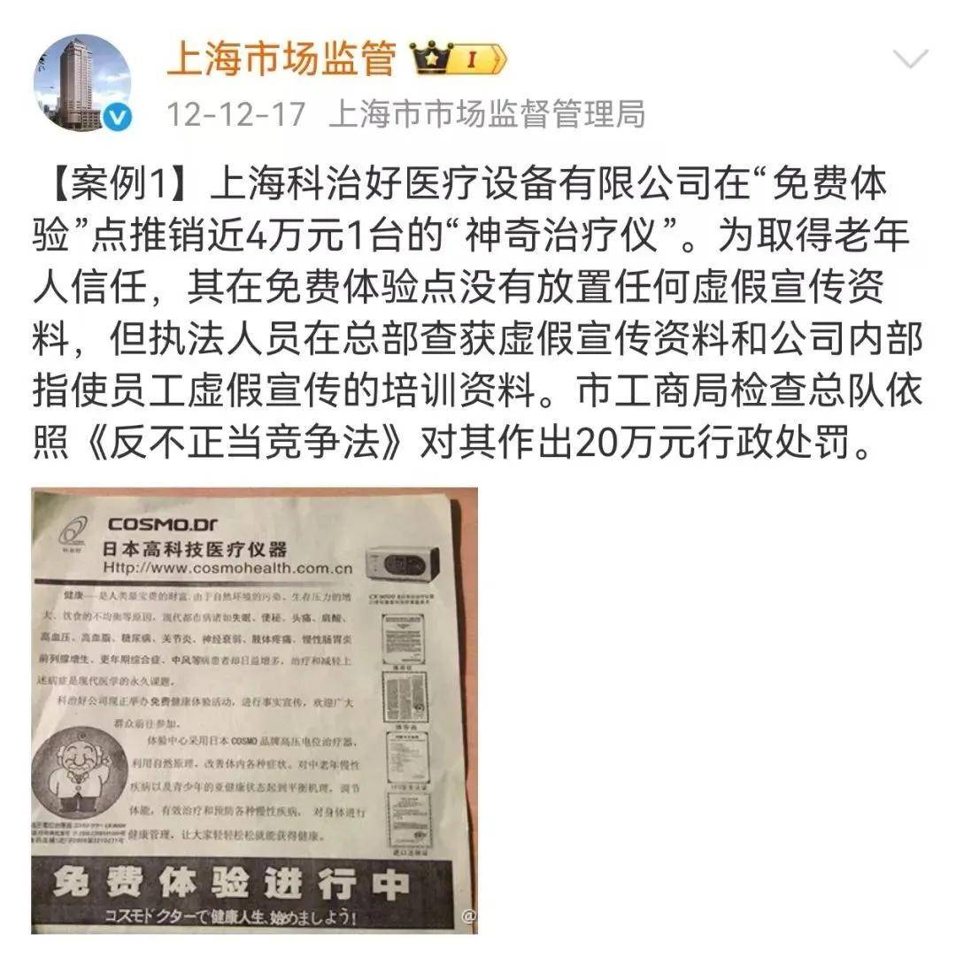 2012年,原上海市工商局通报典型案例称,上海科治好医疗设备有限公司在“免费体验”点推销近4万元1台的“神奇治疗仪”,执法人员在总部查获虚假宣传资料和公司内部指使员工虚假宣传的培训资料。原上海市工商局检查总队依照《反不正当竞争法》对其作出20万元行政处罚。